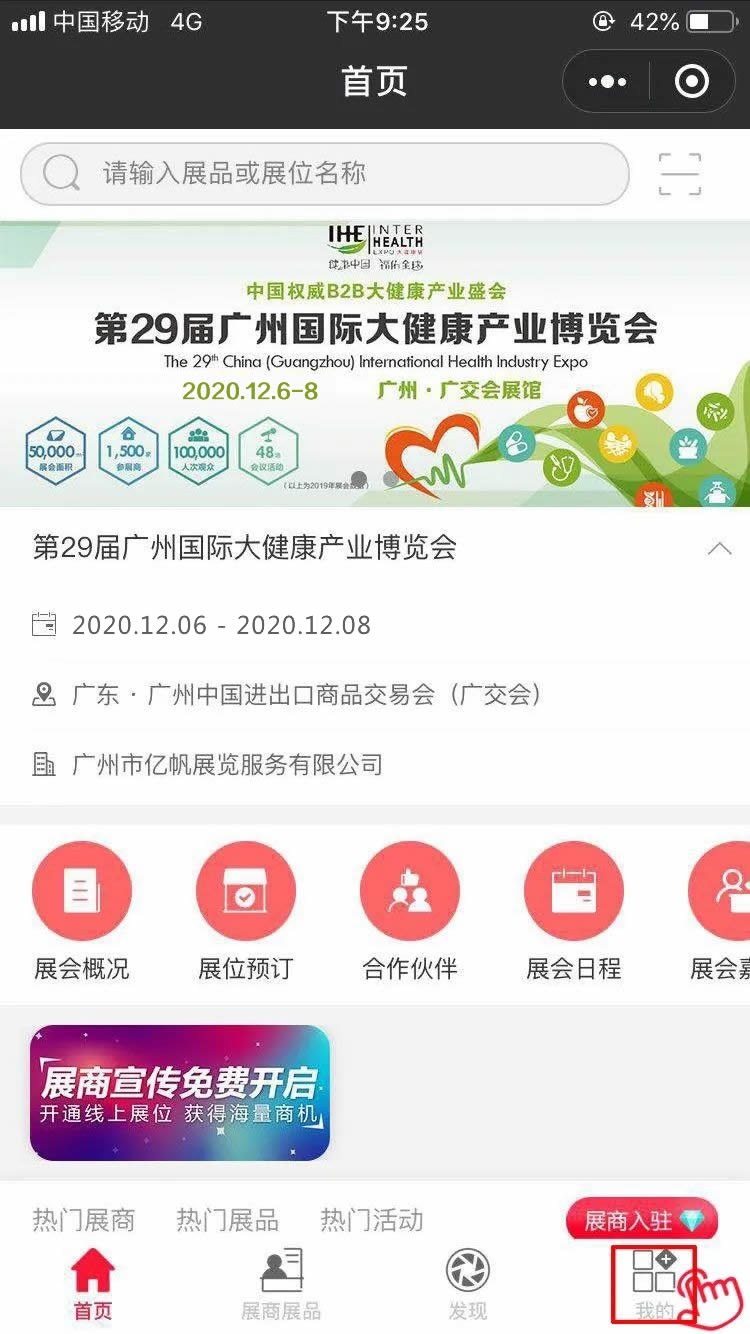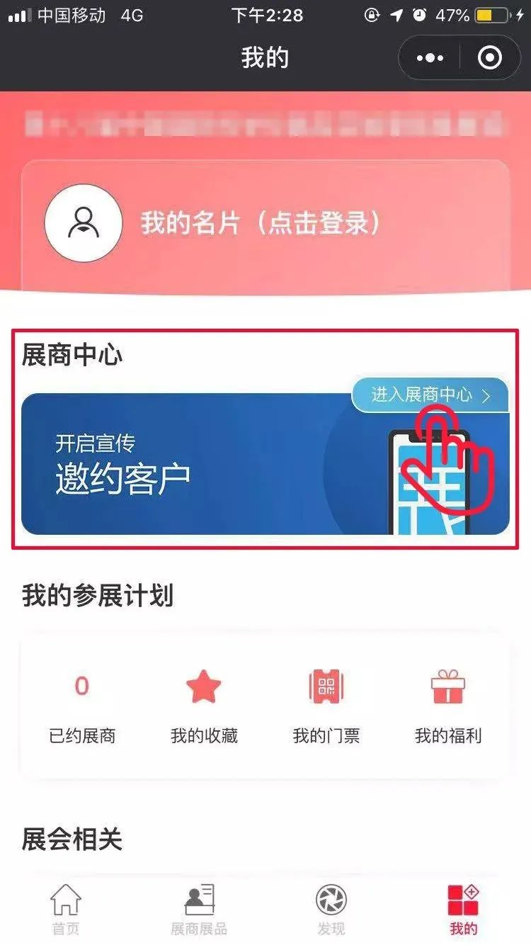 STEP 4:展商可以点击首页右下角「我的」进入「展商中心」,可以查看并修改基本信息、管理展品、活动,开启邀约客户。