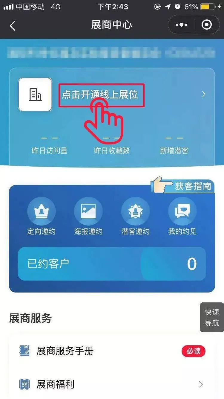 STEP 3: 进入展商中心页,「点击开通线上展位」,按页面提示完善相关信息,经组委会审核通过后,展位即在小程序首页展示。
