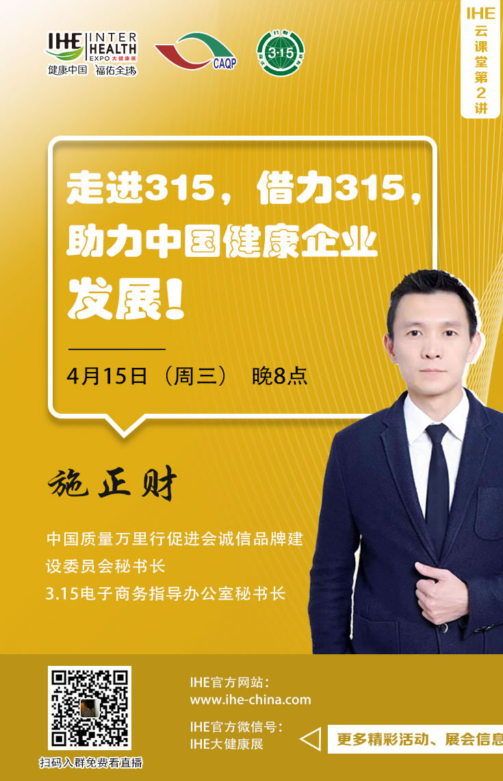 4月15晚8点,3.15电商办秘书长施正财做客IHE China大健康云课堂,为您带来满满干货!