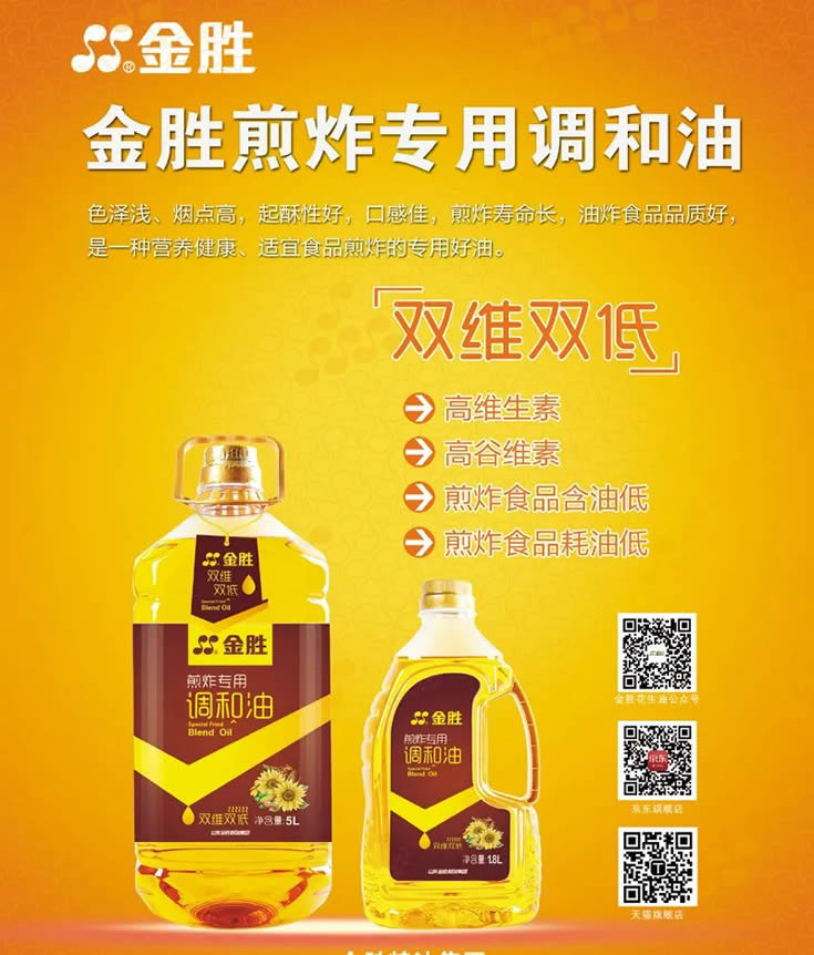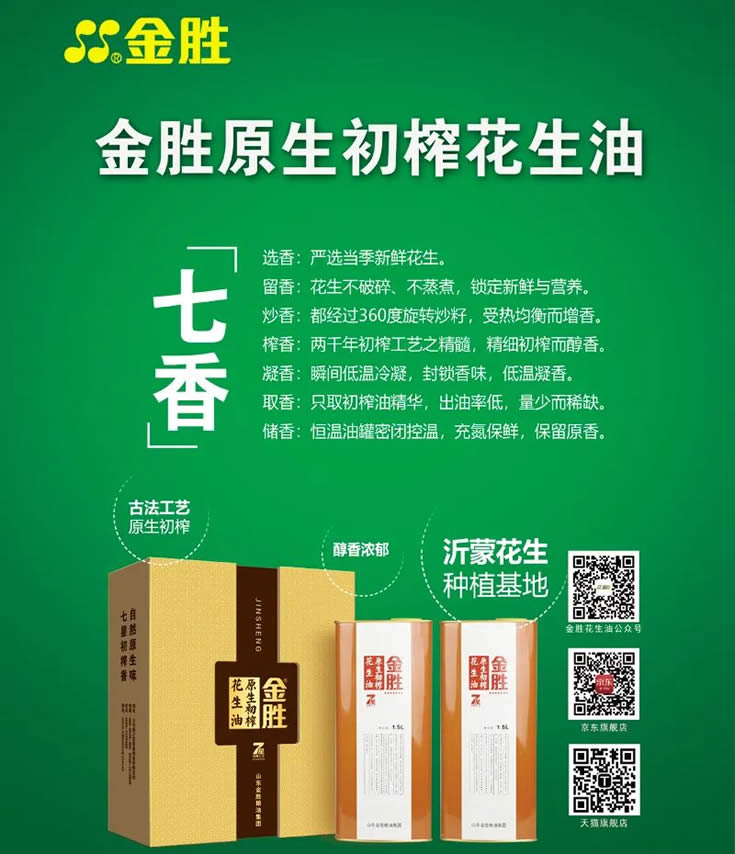 金胜粮油集团,始建于1947年,位于中国花生之乡-莒南县,是一家集油脂花生、生物科技、外贸进出口、餐饮旅游、电商物流、生态农业等多种经营为一体的综合性集团企业,公司先后获得“全国首届放心粮油示范加工企业”、“国家重点支持粮油产业化龙头企业”、“国家高新技术企业“、“全国农产品加工业示范企业”、“中国质量诚信企业”、“中国植物油加工企业50强”、“中国花生油加工企业10强”、“中国好粮油示范企业”、“中国好粮油”食用油标准起草单位等称号。