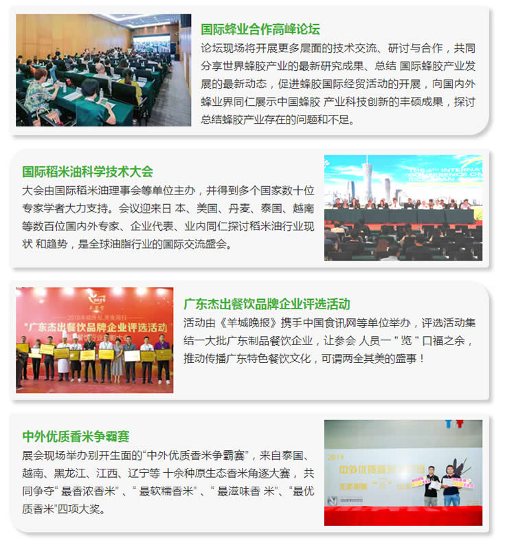 本届展会将举办“国际蜂业合作高峰论坛”、“国际稻米油科学技术大会”、“广东杰出餐饮品牌企业评选活动”、“中外优质香米争霸赛”等行业论坛、奖项评比、系列赛事活动。通过高端对话,多角度梳理当前产业形势,为行业的进一步发展贡献智慧和力量。相信在后疫情时代,订单和生意将会有一个大的反弹,届时预祝大家能在展会上找到更多客户。