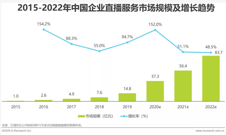 据艾瑞咨询官微发布的企业直播分析报告显示,中国企业直播服务进入发展快通道,2019年突破十亿大关,市场收入规模达到14.8亿元人民币。2020年新冠肺炎疫情使得企业直播迎来第二波发展机遇,预计2020年企业直播服务市场有望达到35亿以上的市场规模。
