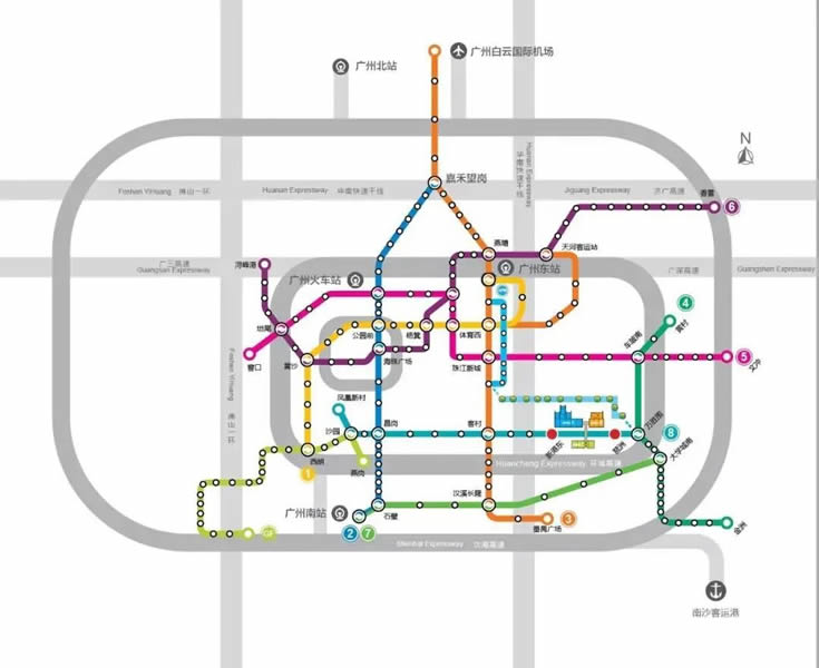 3号线(北延长线)机场北站(2号航站楼)/机场南站(1号航站楼)- 体育西路站(转乘3号线) - 客村站(转乘8号线)- 新港东站(广交会展馆A区)。