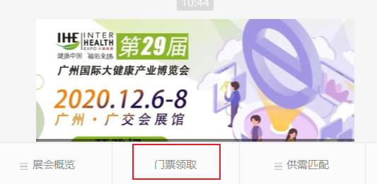 完成预登记后,小H建议截图保存至手机保存,如果没有保存,点击关注“IHE大健康展”公众号,点击菜单栏-门票领取即可看见啦~