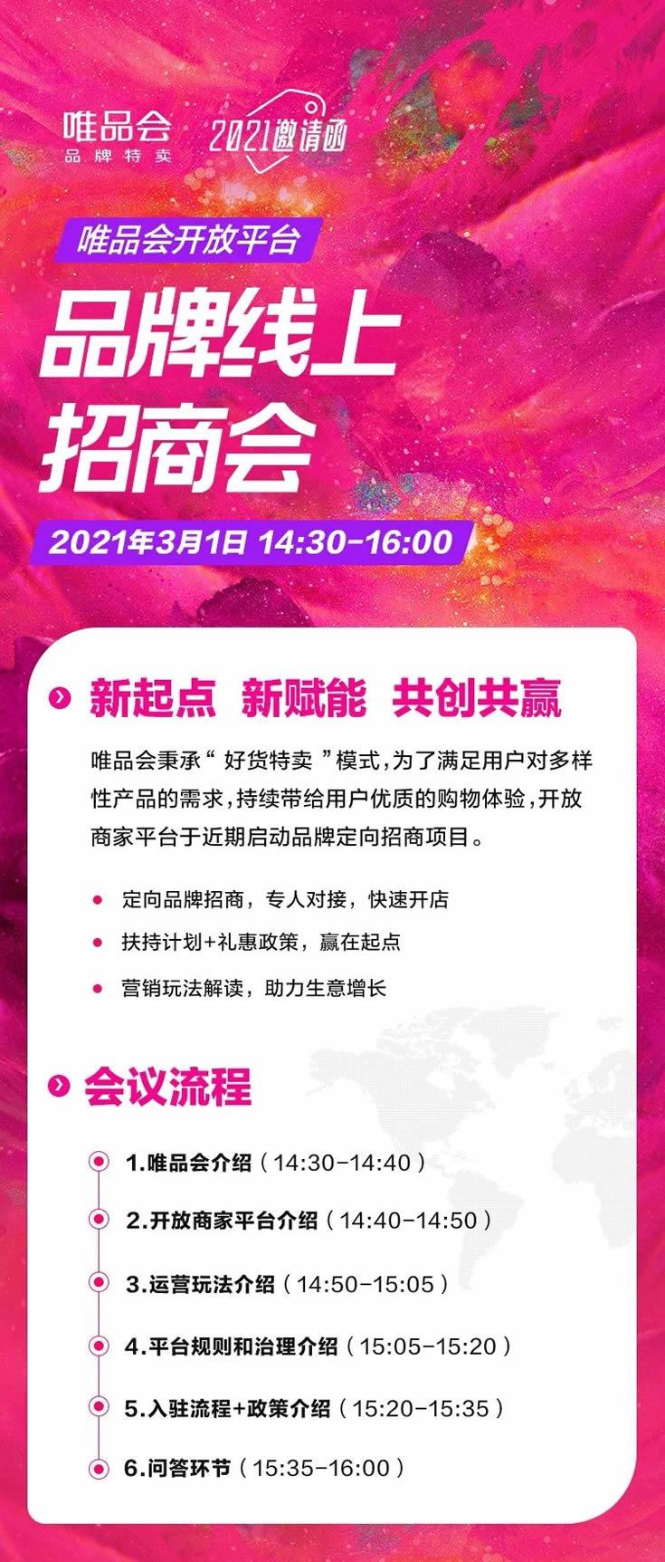为满足用户多样性产品的需求,唯品会MP开放商家平台于近期启动品牌定向招商项目,将于2021年3月1日举办线上招商会。