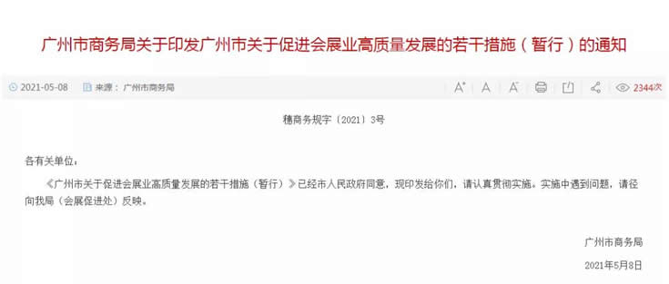 今年5月8日,经市政府同意,广州市商务局向社会公布了《广州市关于促进会展业高质量发展的若干措施(暂行)》,20条措施都是含金量十足的“干货”。