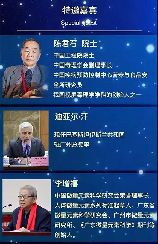 论坛将邀请中国工程院陈君石院士、巴基斯坦伊斯兰共和国驻广州总领事迪亚尔·汗阁下、卫生部微量元素与地方病重点实验室王治伦主任、上海微量元素学会副理事长秦俊法教授、中国微量元素研究会副理事长、省学会秘书长王广仪教授、英国皇家医学院何月蓉院士等科学领域权威专家、学者及有政府部门领导莅临现场,探讨微量元素科学领域最新研究成果,推进微量元素科研、应用及产业化,带动健康产业协同发展。