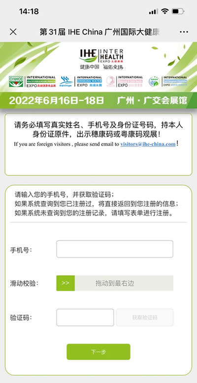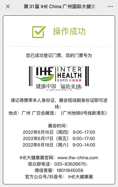 扫码进入展会预登记页面,按要求填写参观者“手机号及验证码”信息,填写完成后点击【下一步】,系统显示“操作成功”,即可获取电子门票,届时凭【登记门票】扫码入场。