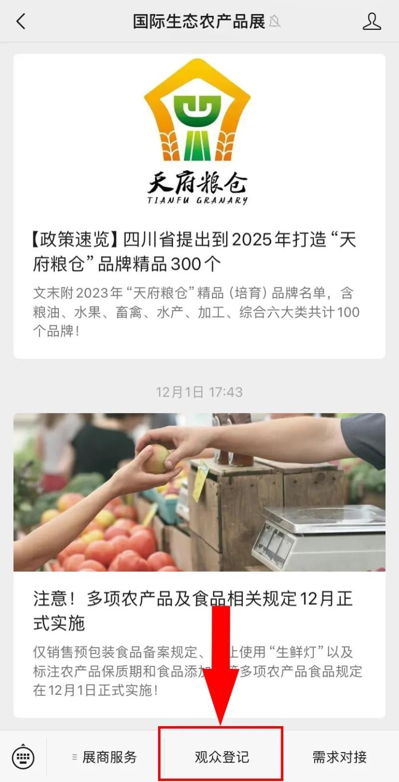 01扫码关注公众号STEP1:扫码关注展会公众号“国际生态农产品展”。 |