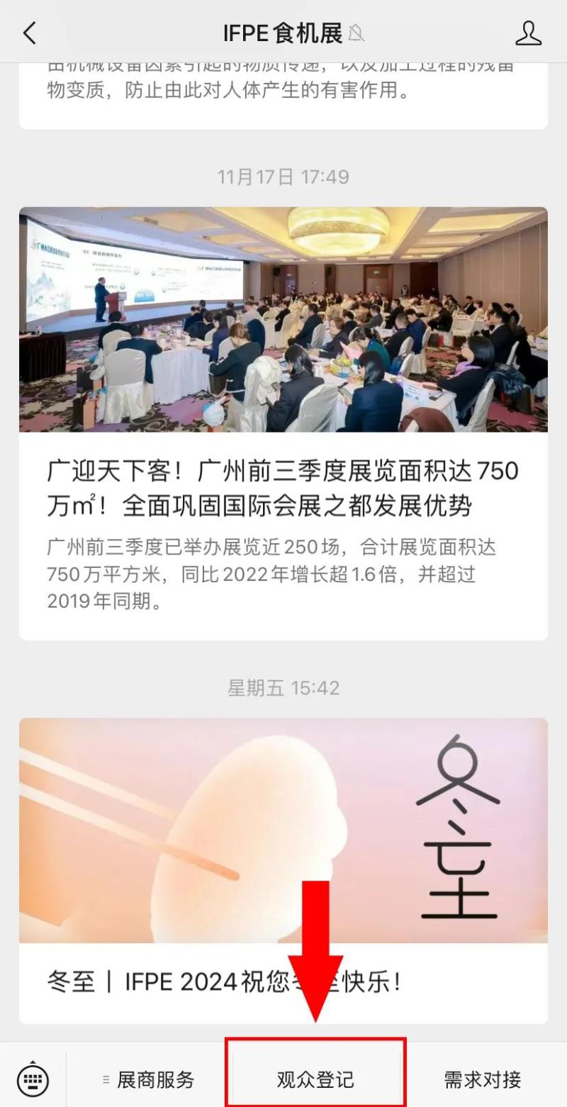 01 关注官方微信公众号步骤1:关注官方公众号“IFPE食机展” |