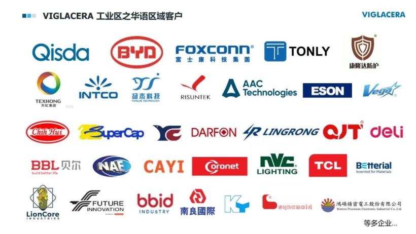 截至目前,VIGLACERA工业区成功吸引国内外300多家企业,如:三星、安靠、晓星、好丽友、乐扣乐扣、比亚迪、富士康、佳世达、得力、天虹、佳能等全球大型企业,外资投资资金达160亿美元。