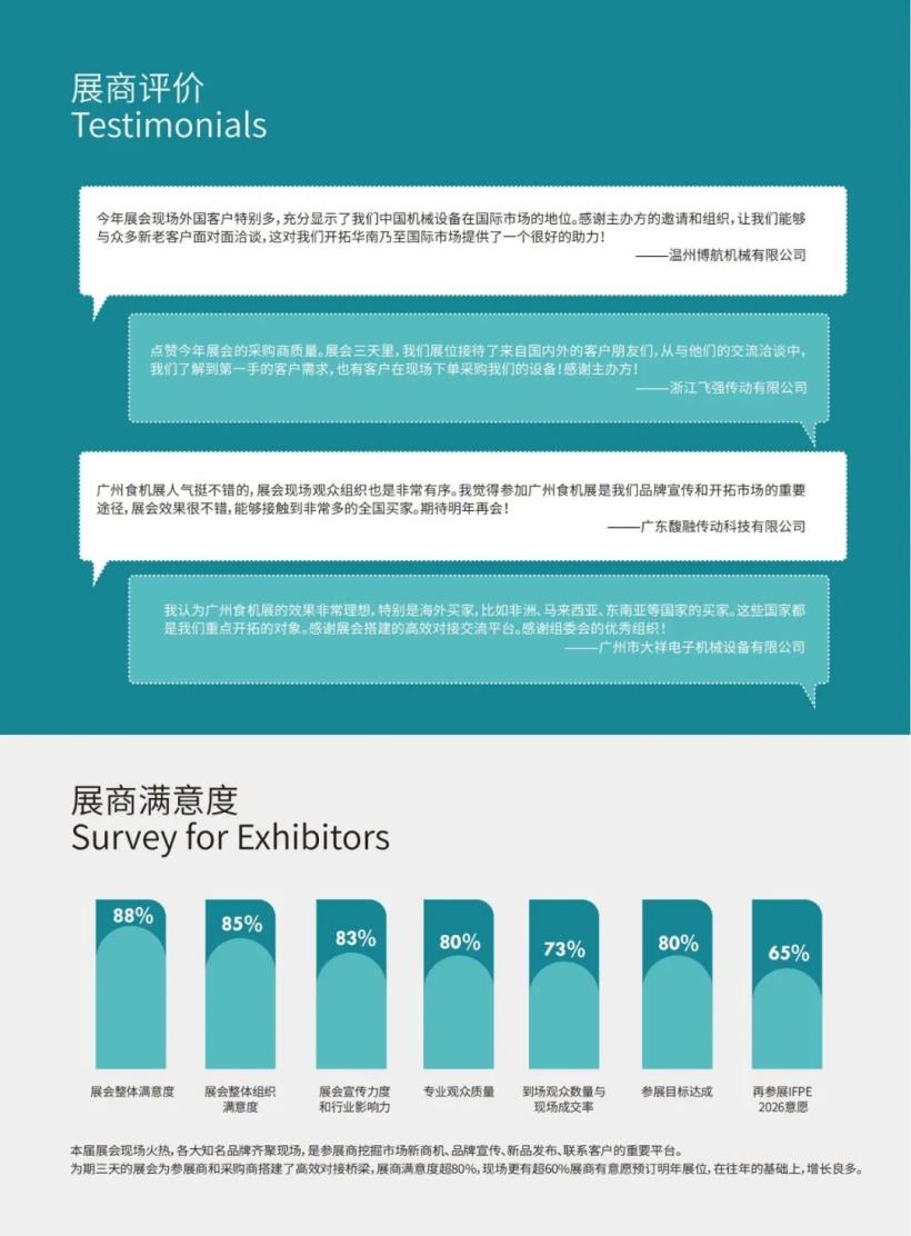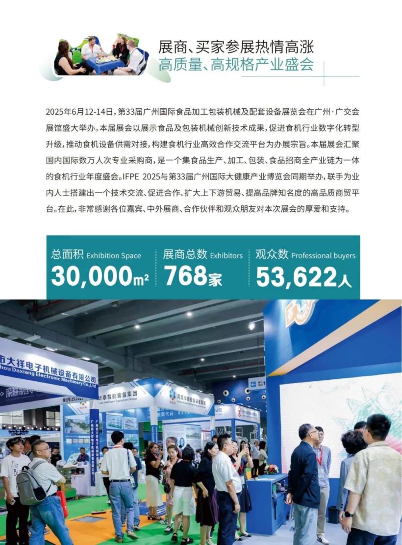 2025年6月12-14日,第33届广州国际食品加工包装机械及配套设备展览会在羊城广州盛大举办。本次展会汇聚食品加工机械、食品包装设备、食品饮料机械、包装材料、配套器材、包装印刷机械等众多细分板块的领军企业和品牌。IFPE 2025以展示食品及包装机械创新技术成果,促进食机行业数字化转型升级,加快产业链上下游供需对接为办展宗旨。展会精准邀约数万人次国内外专业采购商参展,为食机产业搭建了一个高效合作对接交流平台,获得了广大参展商和采购商的共同赞誉。