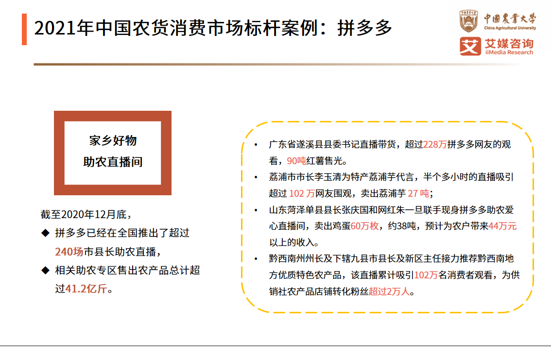 拼多多在农货电商市场优势明显,具有庞大的用户基础,在助力农货产品标准化、品牌化、重塑产业链条、提升产业效率方面发挥了极大的作用。平台利用自身“农地云拼”的模式优势、资金优势、人才优势等,通过帮助当地甄选特色农产品,扶持特色产业,提供全方位支持,帮小农户对接大市场。