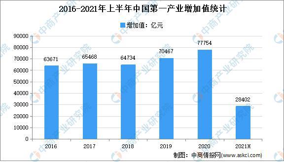 数据显示,2020年国内生产总值1015986亿元,按可比价格计算,比上年增长2.3%;第一产业增加值77754亿元,比上年增长3.0%。2021年上半年第一产业增加值28402亿元,同比增长7.8%,两年平均增长4.3%。