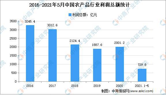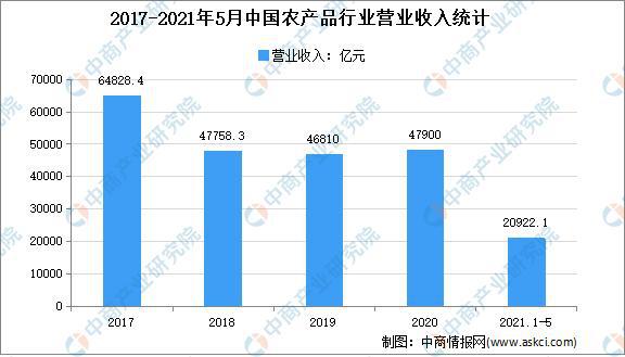 数据显示,2020年我国农产品行业营业收入达4.79万亿元,同比增长2.2%;行业利润总额突破2000亿元,同比增长5.9%。2021年5月我国农产品行业营业收入达20922.1亿元,累计大幅增长19.5%,行业实现利润总额达729.8亿元,累计增长11%。