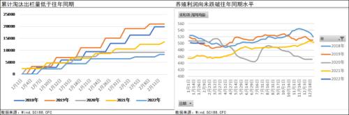 一方面,存栏和淘汰的去化速度在进入1月后有所放缓,与前两年同期做对比来看,22年利润降幅不大的情况下,1-2月淘汰的水平并没有超过往年同期的情况,说明养殖利润并未深度亏损。