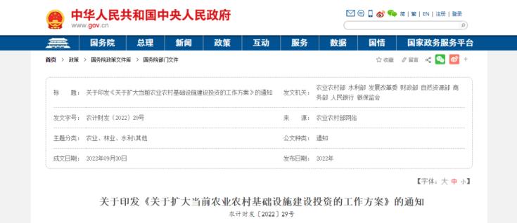 近日,农业农村部、水利部、国家发展和改革委员会、财政部、自然资源部、商务部、中国人民银行、中国银行保险监督管理委员会联合印发《关于扩大当前农业农村基础设施建设投资的工作方案》通知,具体内容如下。