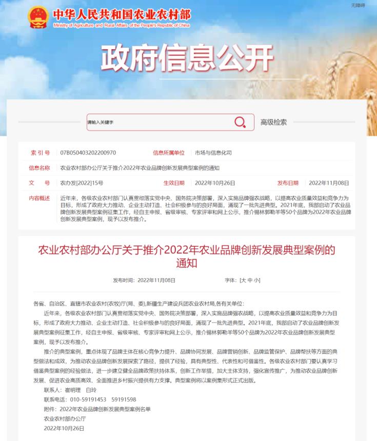 近日,农业农村部办公厅印发《关于推介2022年农业品牌创新发展典型案例的通知》。经自主申报、省级审核、专家评审和网上公示,农业农村部推介锡林郭勒羊等50个品牌为2022年农业品牌创新发展典型案例,现予以发布推介。