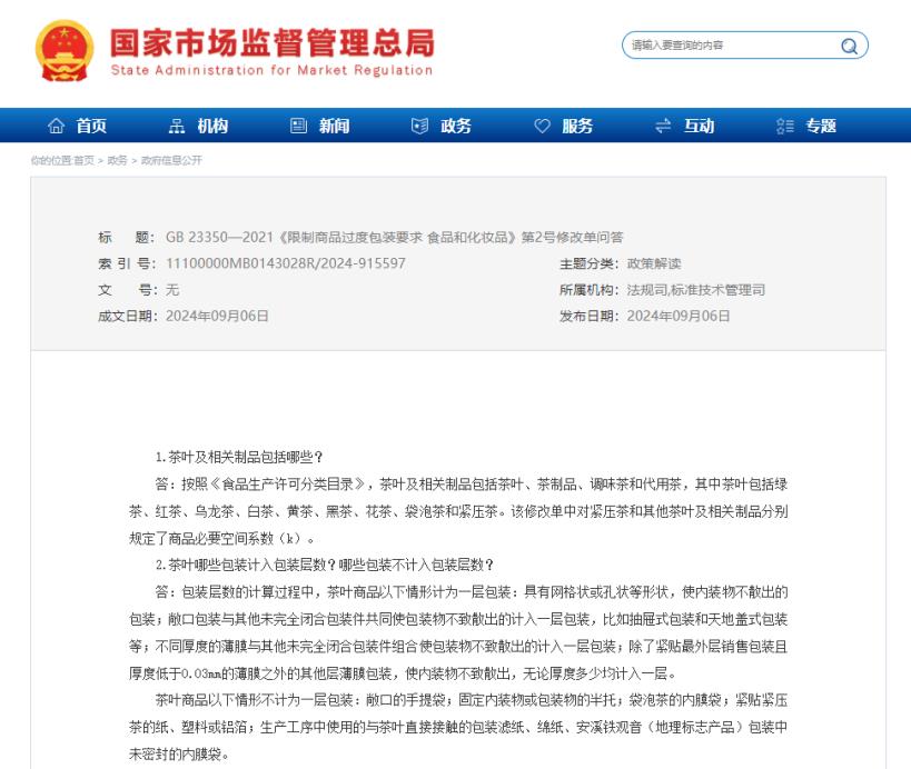 今年3月25日,《限制商品过度包装要求 食品和化妆品》第2号修改单正式发布,并将于2025年3月1日正式实施。修改单主要对茶叶及相关制品包装的要求进行了新规定,主要包括: